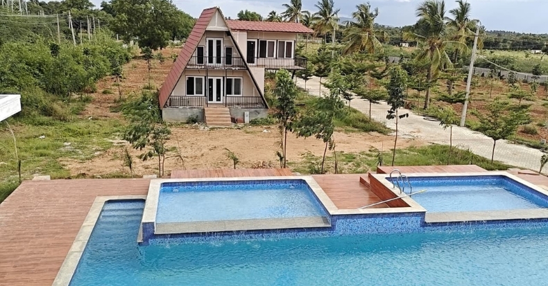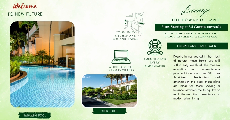 Adding to the uniqueness of the project are amenities such as a well-maintained cottage in the common area, a beautifully designed restaurant, a library for quiet reflection, and a convention hall with the majestic Ashtalakshmi Mantapa—perfect for events and celebrations. For those interested in agricultural pursuits, farming assistance is also provided, making it a true nature-centric lifestyle destination.
